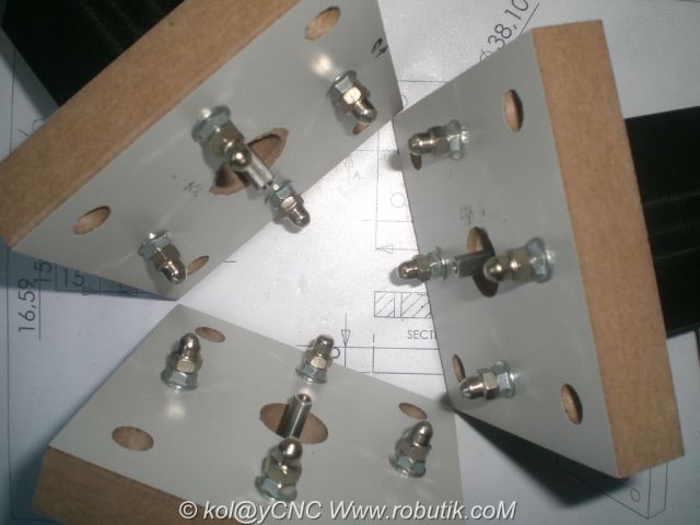 •   M8x20mm alyen cıvata ve M8 “kontr” somunları ( bu somunların et kalınlığı normalinden biraz daha ince oluyorlar) bütün eksenler için toplam : 32 adet M8x20mm imbus (alyen) cıvata, 64 adet M8 kontr somun