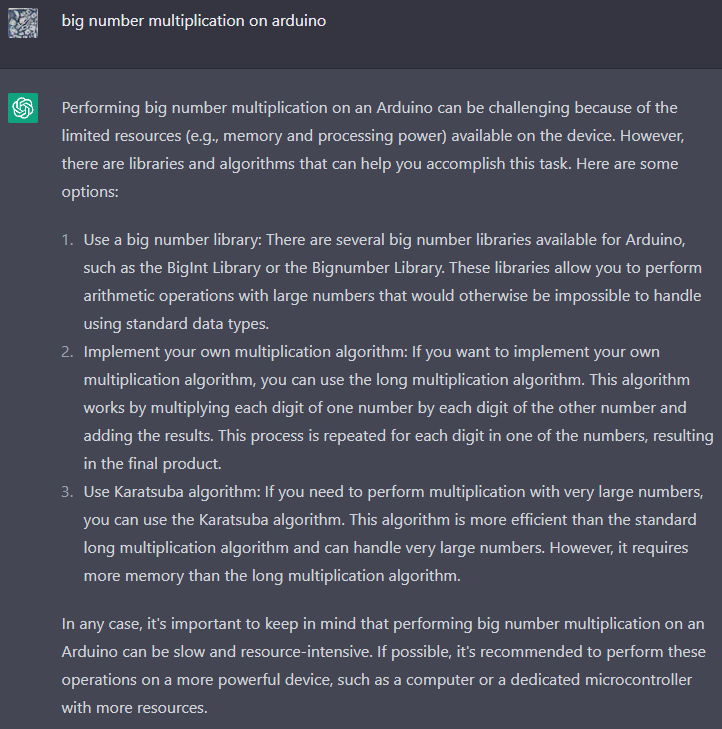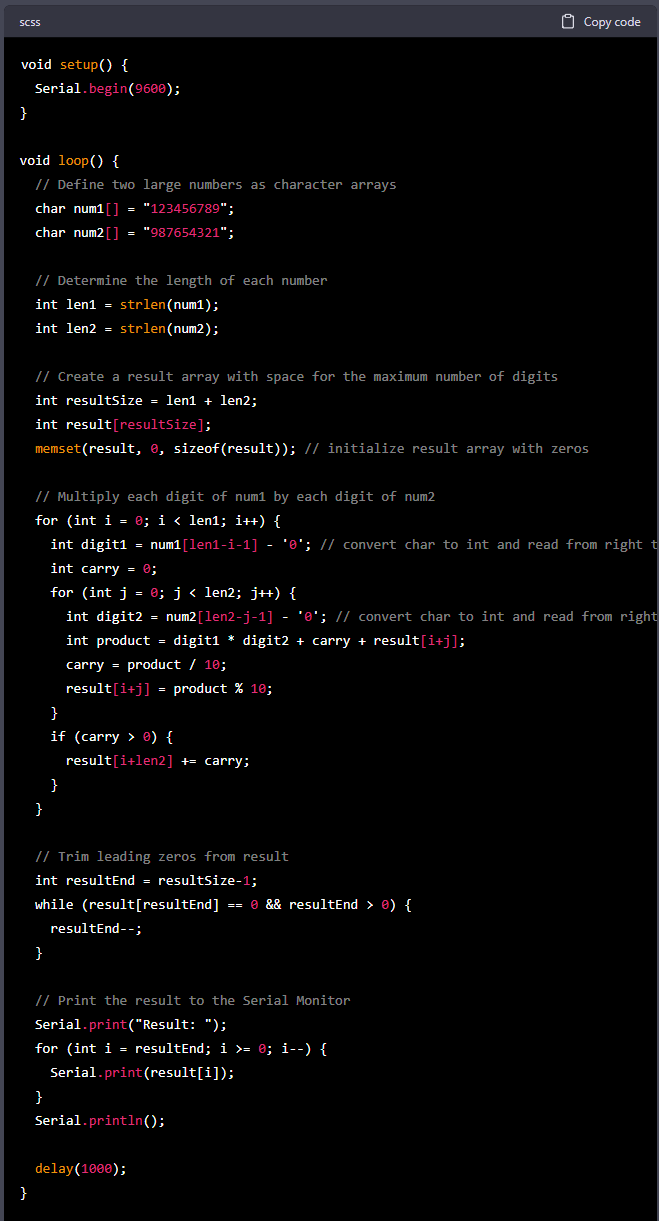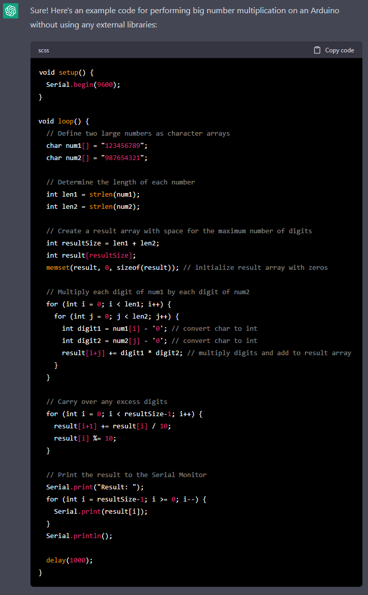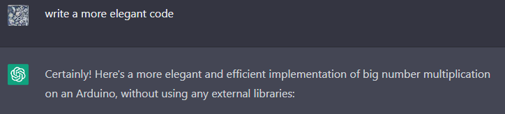 Çok büyük sayılar çarpımını yapabilecek bir Arduino programını yazması için chat kutusuna yazmaya başladım.