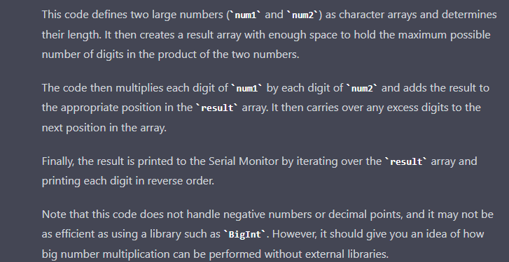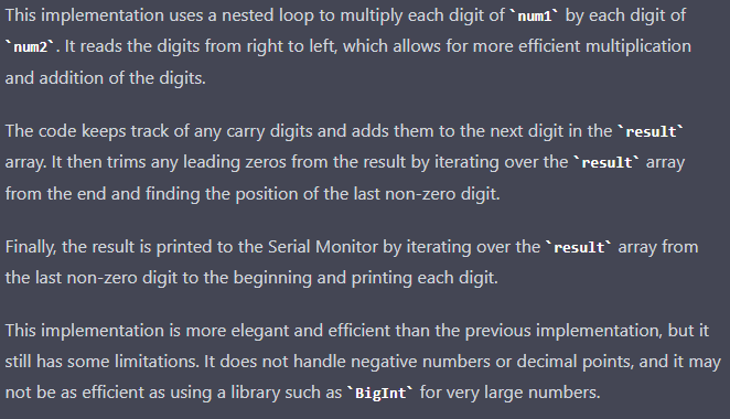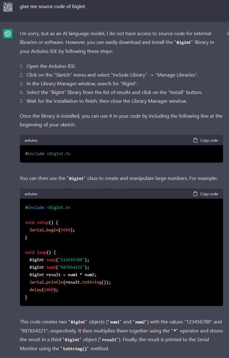 Arduino için büyük sayıların çarpımını diye yazdım ChatGPT’ nin bana hop doğrudan kod yazacağını sandım meğer bana nasıl yapacağıma dair yol gösteren bir yazı döktü. İyi başladık dedim. Verilen cevaptan çok tatmin olmamıştım. Göklere çıkartılan yapay zeka bu mu diye içimden geçirdim. Aklıma bir kısa videodan birşeyler kalmıştı yapay zekaya detaylı olarak ne istediğini yazmazsanız cevabı tatmin edici olmaz diyordu. Bende ısrarla bana kendini biraz zorla dedim. Malesef anlmıyorum ne demek istediğini diye cevap verdi. Hay dedim bundan 10 15 sene önce buna benzer uygulamalar vardı çattık dedim. aşağıda ki resimde neler yazdığını görebilrsiniz.ChatGPT nin sadece ingilizce anladığını sandığım için türkçe yazmadım.